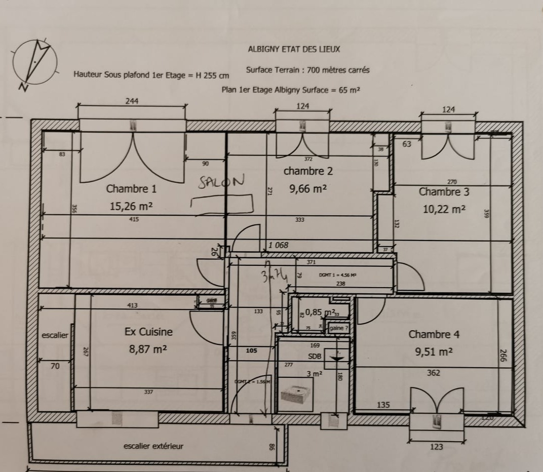 Voilà le plan de l'étage actuel. A Noter que la Chambre 1 et Chambre 2 communiquent, j'ai fait un espace bureau dans l'espace Chambre 2. Mais il n'y a pas de cloison.